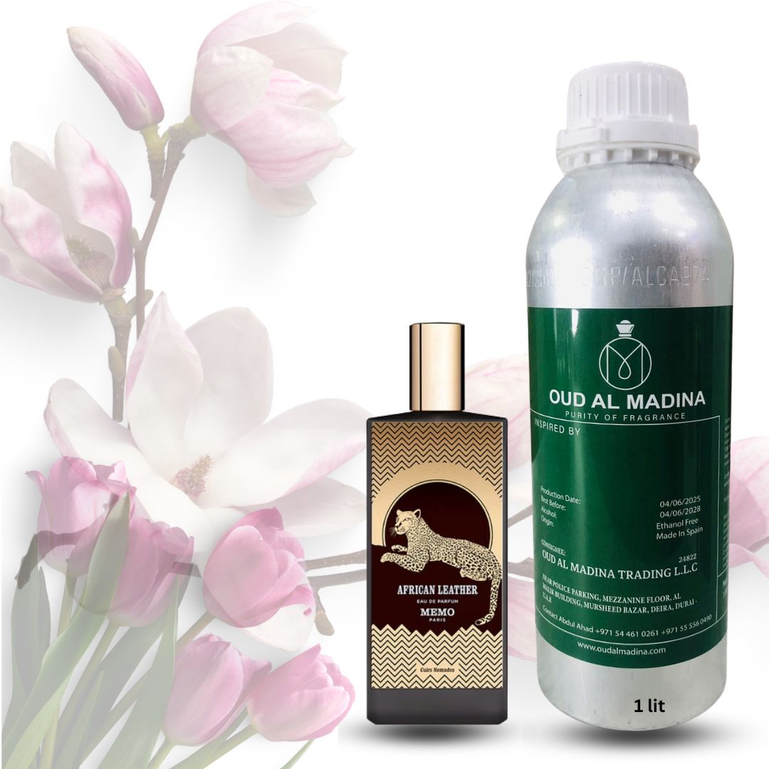 African Leather, Top notes are Cardamom, Geranium, and Pink Pepper; middle notes are Patchouli, Cinnamon, and Rose; base notes are Leather, Oud, and Amber.