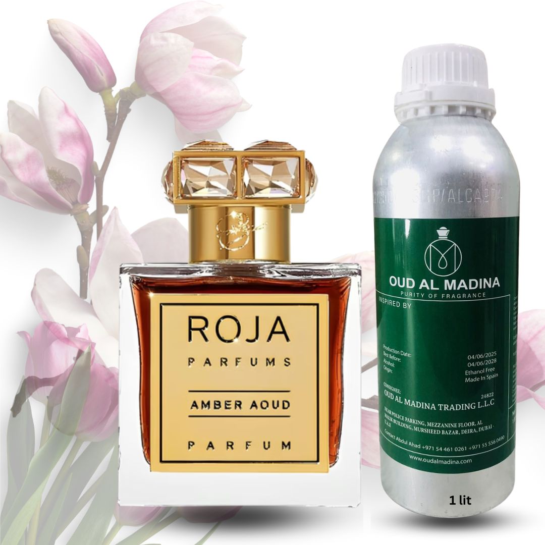 Amber Aoud by Roja Dove Top notes are Bergamot, Lime, and Lemon; middle notes are Rose, Fig, Ylang-Ylang, and Jasmine; base notes are Agarwood, Ambergris, Saffron, Civet, Musk, Sandalwood, Cinnamon, Orris Root, Patchouli, Birch, and Oakmoss.